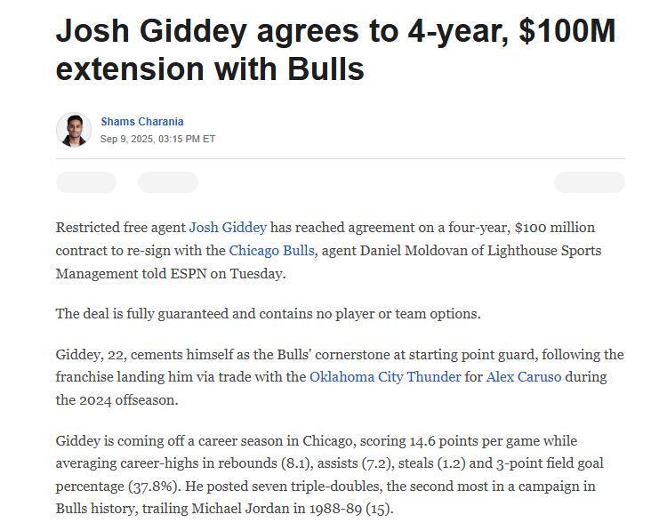 不久后Shams跟进指出,吉迪这份4年1亿美元合同为全额保障,其中不包含任何球员与球队选项,可见公牛队对他的信任与看好。